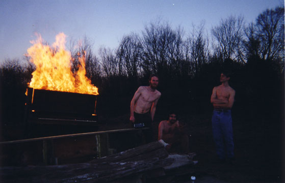 Junkyard: Bill, Steve and Jake posing shirtless as the piano burns